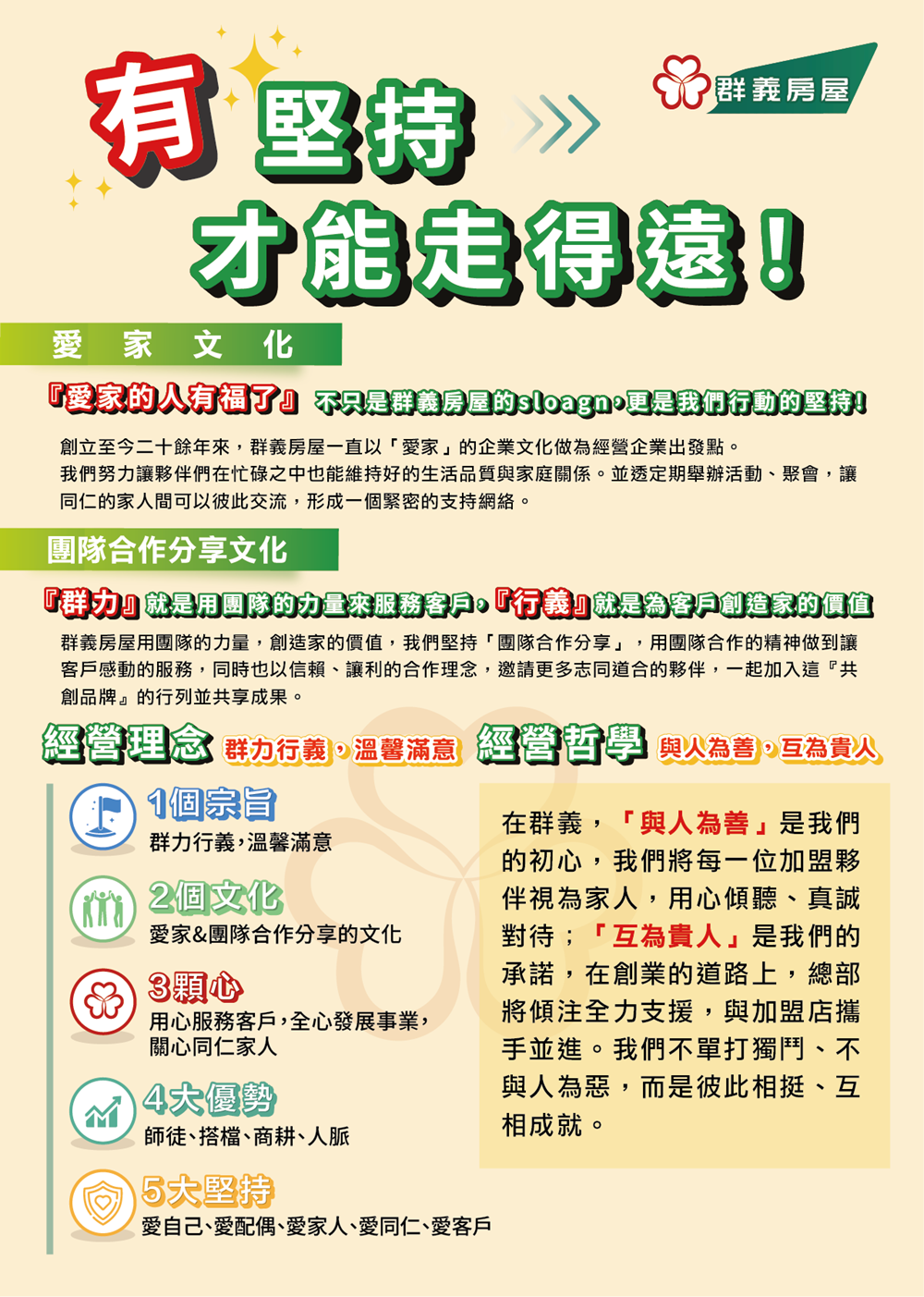 創立至今二十餘年來,群義房屋一直以「愛家」的企業文化做為經營企業出發點。