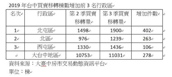 根據「大臺中房市交易動態資訊平台」房市分析季報統計,今年第3季台中買賣移轉棟數為11031棟,季增2.6%、年增17.9%。今年累計至11月為止,買賣移轉登記棟數共計39013棟,暫時優於去年同期36111棟表現,領先約8%。