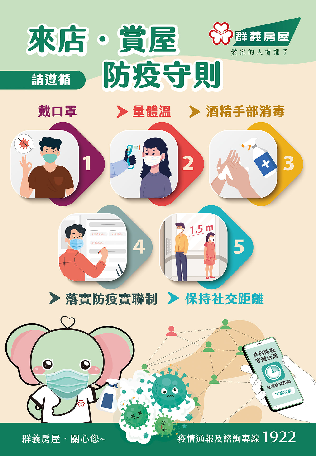 群義房屋總部已請各門市、同仁加強防疫😷,並張貼【防疫守則海報】時時刻刻提醒同仁、客戶做好防疫工作,保護自己也保護別人唷😙
