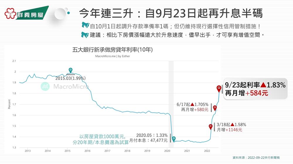 美國聯準會宣布升息3碼,台灣央行昨天(9/22)也宣布跟進政策利率調升半碼(0.125個百分點),房貸利率將來到1.83%,自今天(9/23)起實施。這也是央行今年自3/17、6/16後,第三度升息