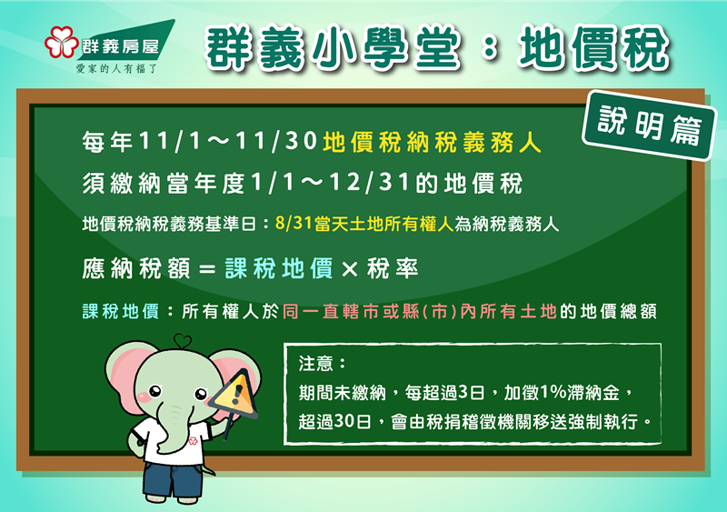 11/1~11/30為本年度地價稅繳納期間,群義房屋提醒您記得按時繳納,以免受罰唷⚠