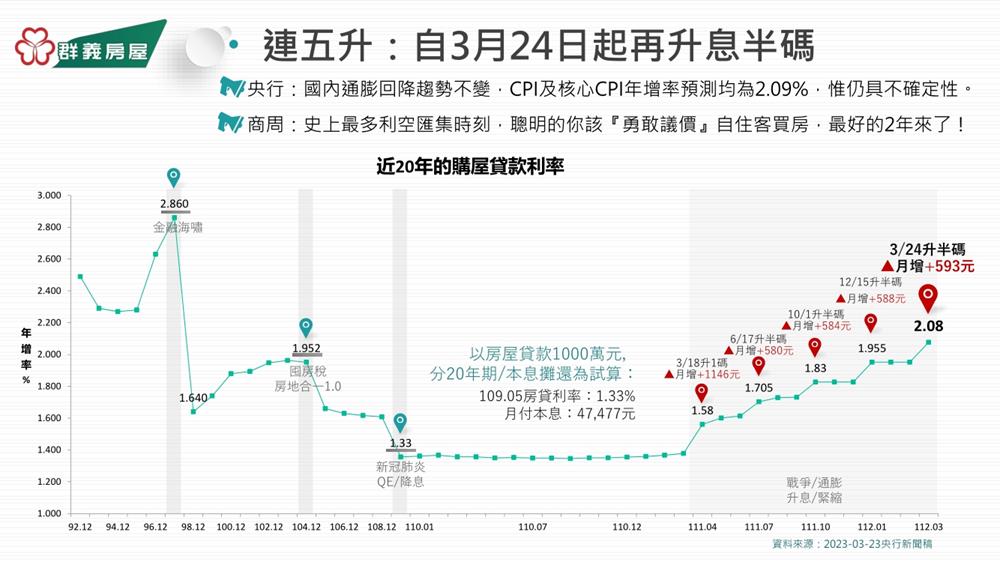 隨著美國聯準會今天升息1碼,台灣央行今天(3/23)也宣布再跟進政策利率調升半碼(0.125個百分點),房貸利率將來到2.08%,自明天(3/24)起實施。這也是央行自去年3/18、6/17、10/1、12/15後,第五度升息📈