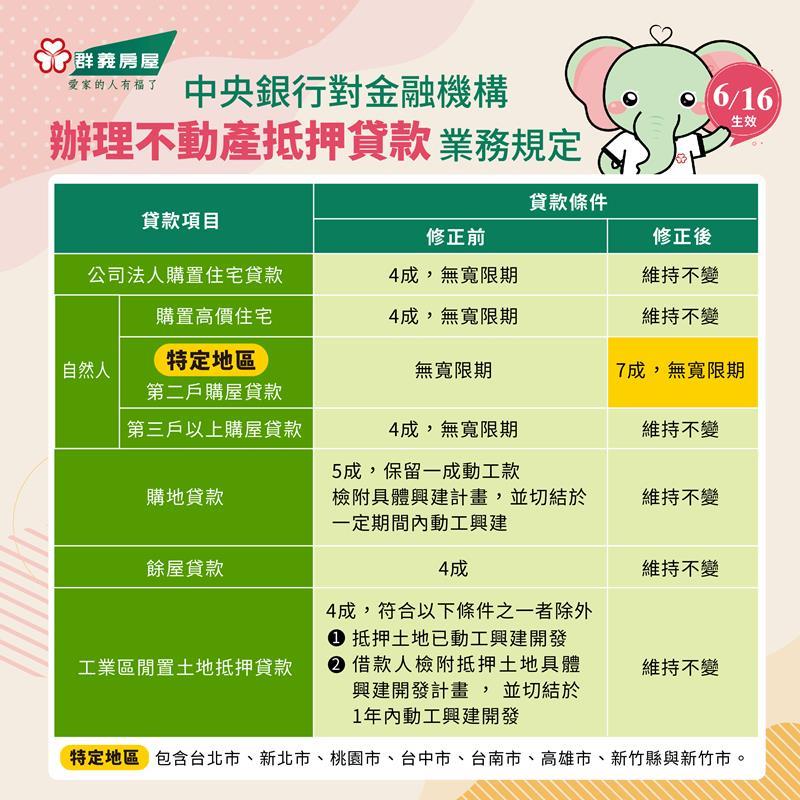 2⃣第五度調整選擇性信用管制措施,新增規範自然人特定地區第2戶購屋貸款最高成數上限為7成,自6/16起實施。