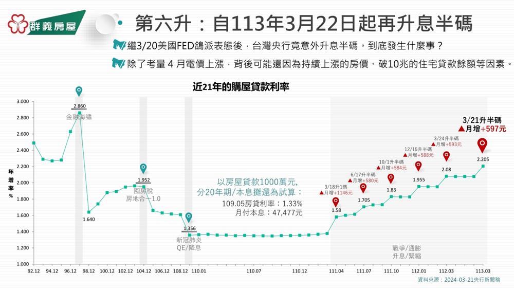儘管美國聯準會(FED)宣布本次利率不變,但台灣央行為了抑制國內通膨預期心理,今天宣布政策利率再調升半碼(0.125個百分點),房貸利率將來到2.205%,自明天(3/22)起實施。這也是央行自前年3/18、6/17、10/1、12/15、去年/3/24後,第六度升息📈