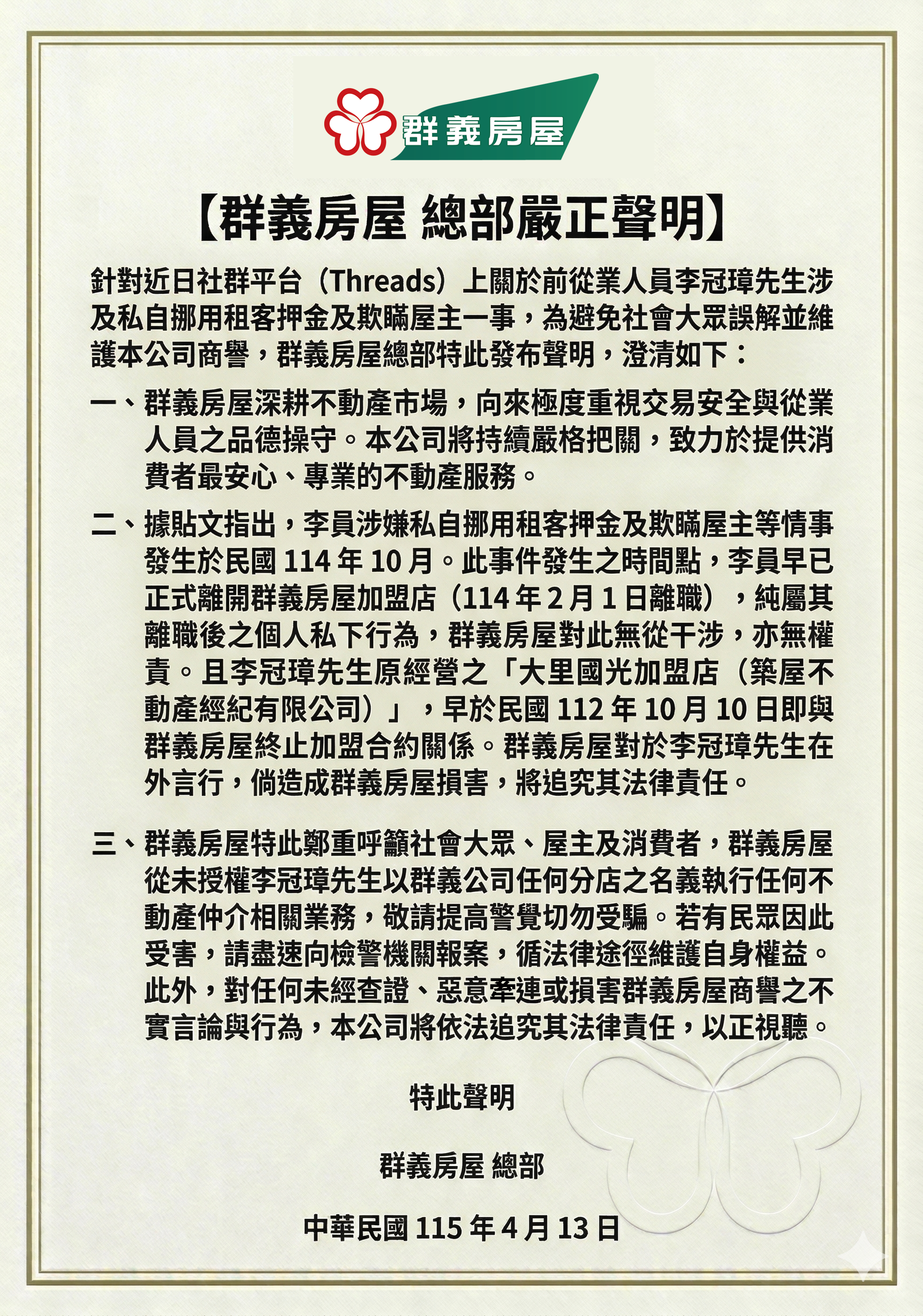 關於群義房屋前從業人員李冠璋先生所涉之爭議,總部的嚴正聲明