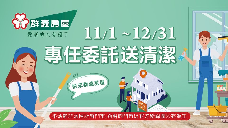 房市正夯,群義房屋的服務也持續提升,為了幫客戶更積極售屋,11/1起到年底,我們推出了【專任委託送清潔】的活動,除了貼心為屋主做更多,也希望藉由專業的清潔,給客戶一個乾淨舒適的家