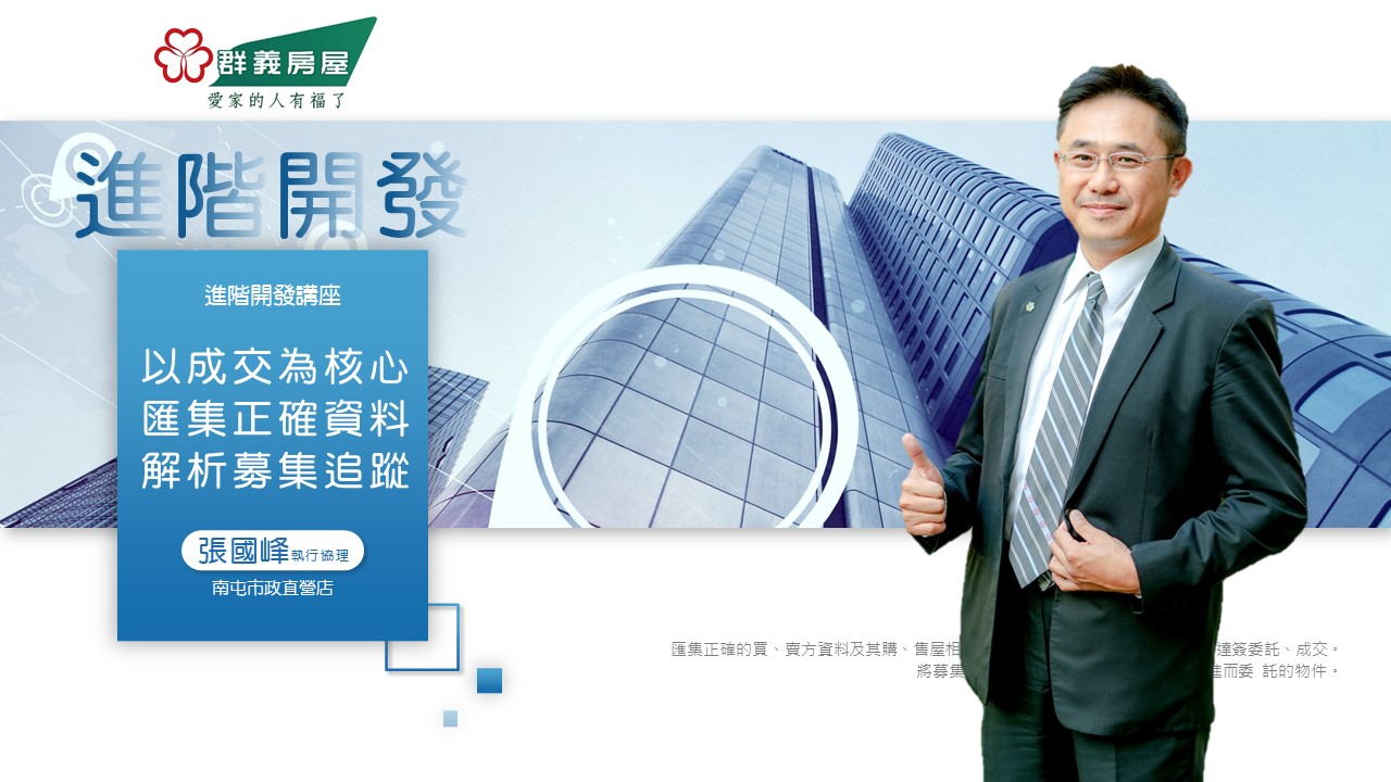 今天這堂課,群義總部就針對物件開發的議題,為同仁們邀請到熱力十足🔥、有【房仲小金剛】之稱的群義房屋南屯市政店張國峰執協,來為大家分享如何針對物件做進階開發👨💼。