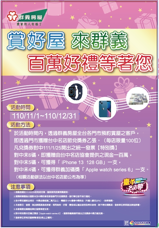 凡於活動時間內,透過群義房屋各大門市賞屋之客戶,即可獲贈【台中名店節】兌獎券乙張