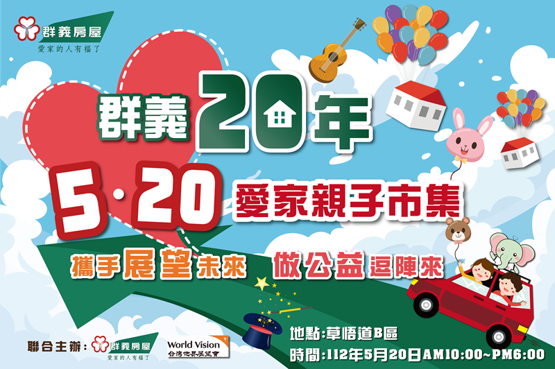 2023是群義房屋成立的20週年,因此我們選定520這個充滿愛的日子,將與一路陪伴我們成長的-『世界展望會』,共同舉辦這場愛家親子市集