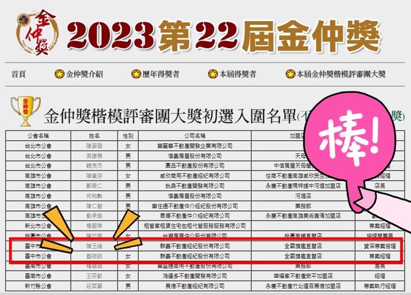 📣恭喜群義房屋陳玉緒協理、藍筱茹經理雙雙入圍2023『👑第22屆金仲獎楷模評審團大獎👑』