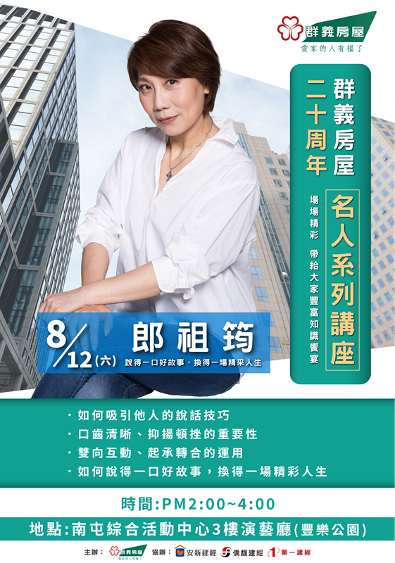 『群義房屋20週年 名人系列講座』第二場台中場8/12(六)要來囉😍本場的講者將由舞台表演經歷超過30年,專業橫跨電視、舞台劇、相聲、電影、廣播等領域,能編能導能演又能主持的『百變女王-郎祖筠老師』來為大家分享。