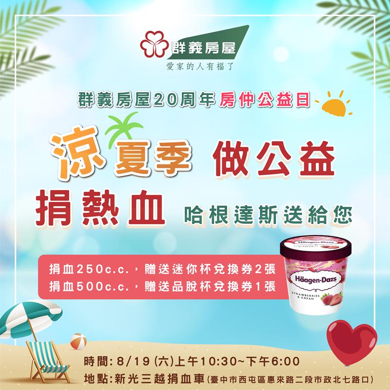 8/19(六),群義房屋誠摯邀請大家一起來新光三越捐血車熱血一夏💖也讓我們請吃哈根達斯冰淇淋唷🍨