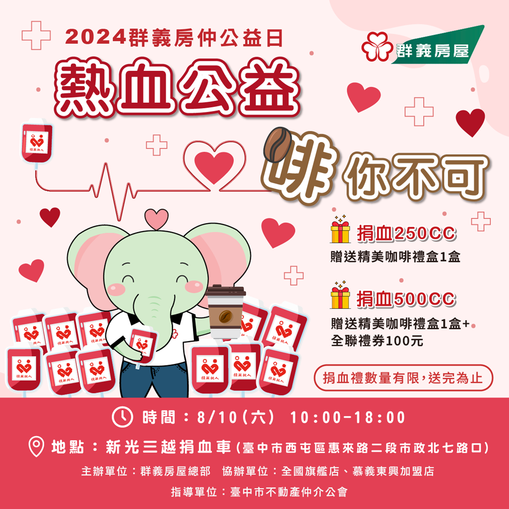 2024群義房屋房仲公益日台中場,我們要誠摯邀請大家一起來挽袖捐熱血,讓我們匯聚滿滿的愛💖持續在社會傳遞正能量~